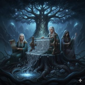 En la mitología escandinava, tres figuras femeninas se sientan a los pies de Yggdrasil, el gran fresno que sostiene los nueves mundos. Son Urd (lo que ha ocurrido), Verdandi (lo que está ocurriendo) y Skuld (lo que va a ocurrir), conocidas como las Nornas.