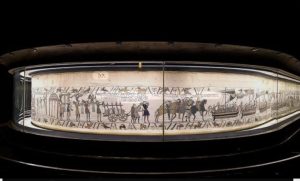 El más famoso es el tapiz de Bayeux, que narra la conquista normanda de Inglaterra a lo largo de casi 70 metros. En realidad es un lienzo de lino bordado con lanas de colores teñidas con tintes naturales. No está tejido en telar pero se ganó se lugar como «tapiz» por la magnitud y el modo en que las fibras se volvieron relato.